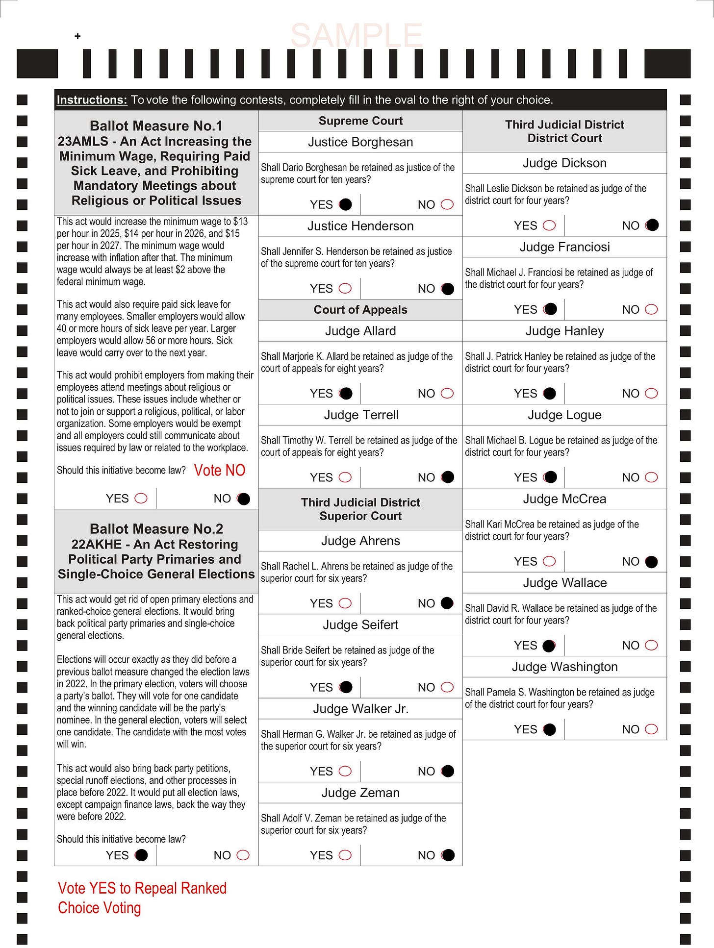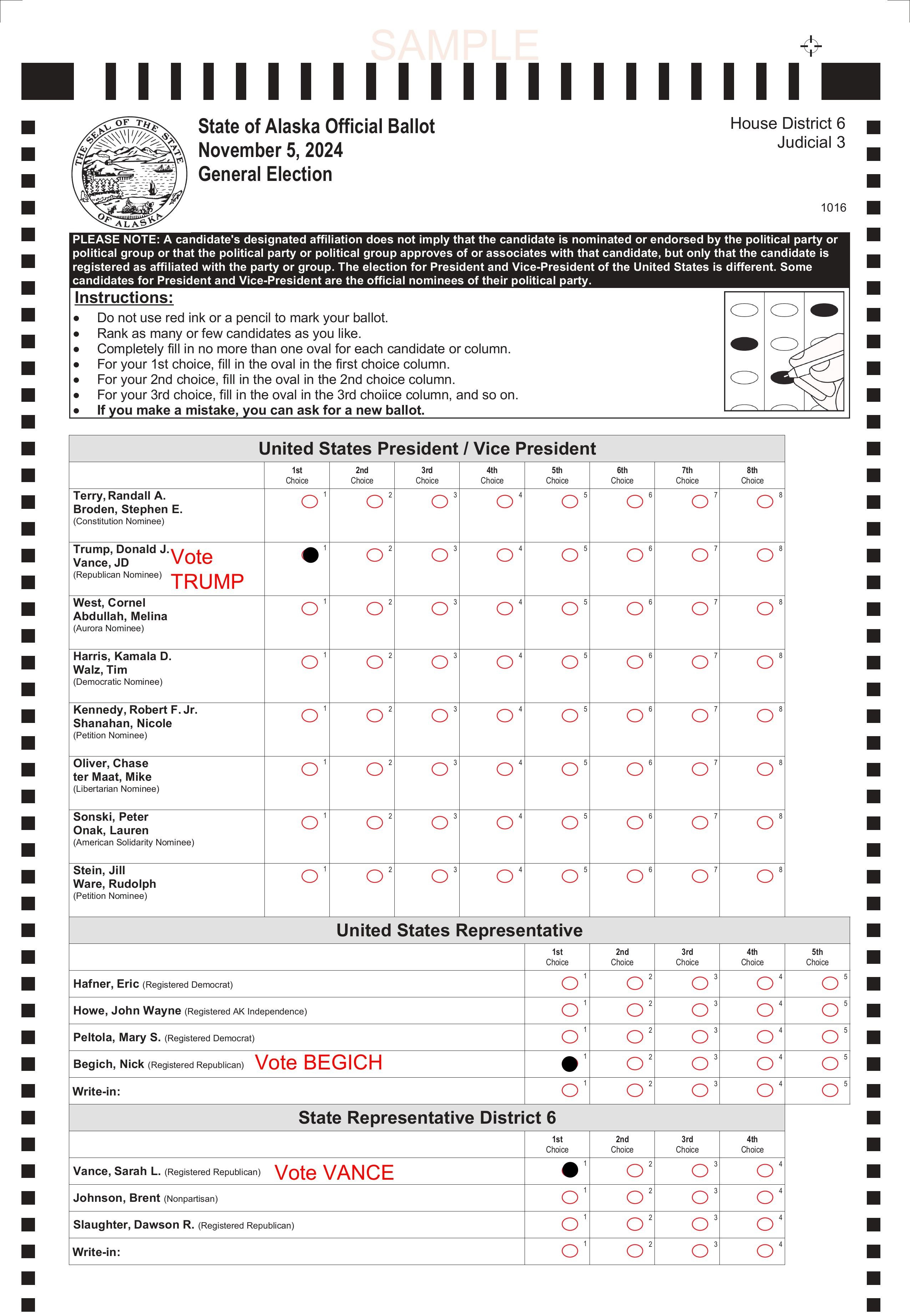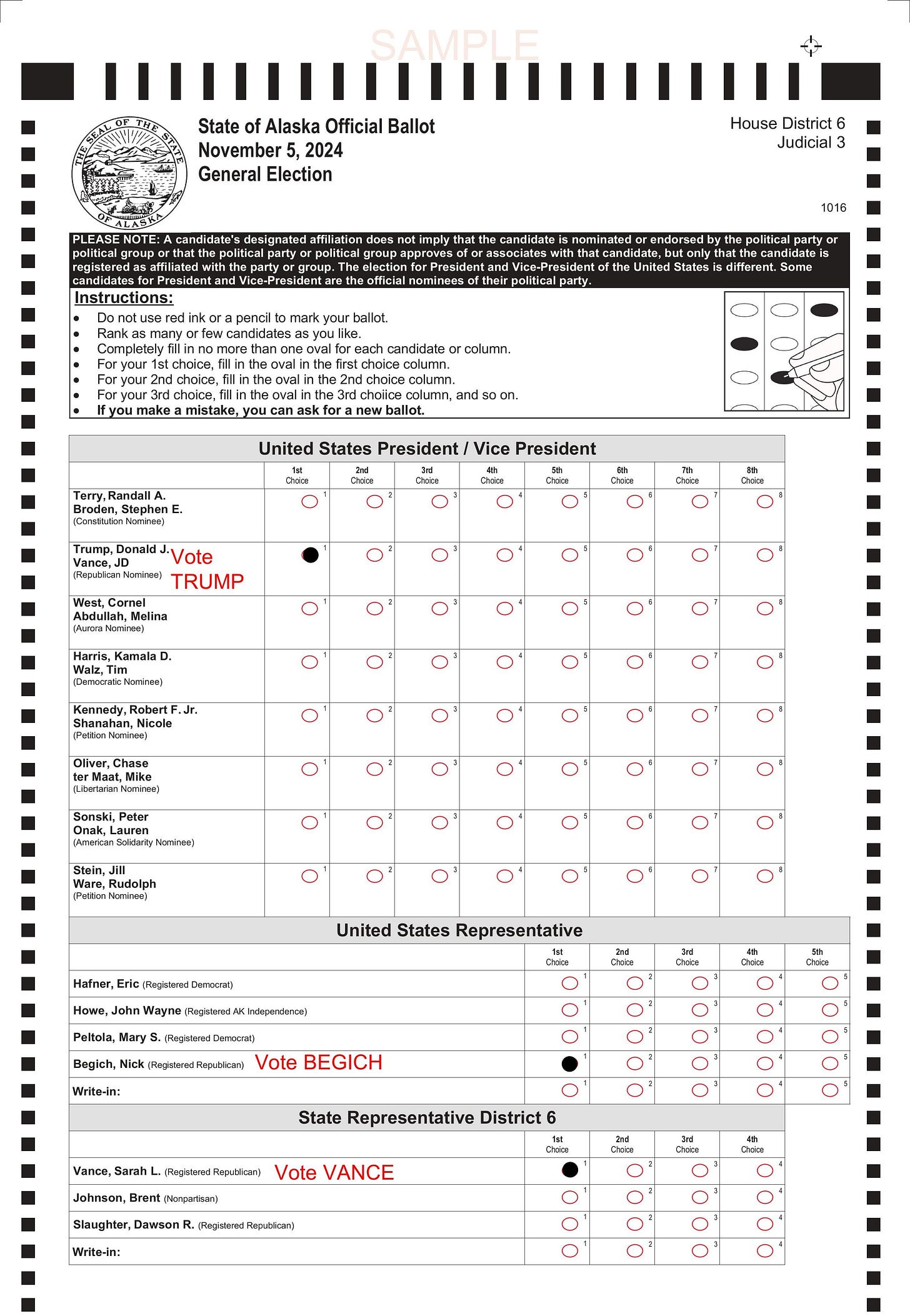 I voted for Republicans Donald Trump and Nick Begich, and for House District 6 Representative Sarah Vance. I also voted against Ballot Measure 1, raising the minimum wage, and for Ballot Measure 2, repealing the Alaska Ranked Choice voting system.
